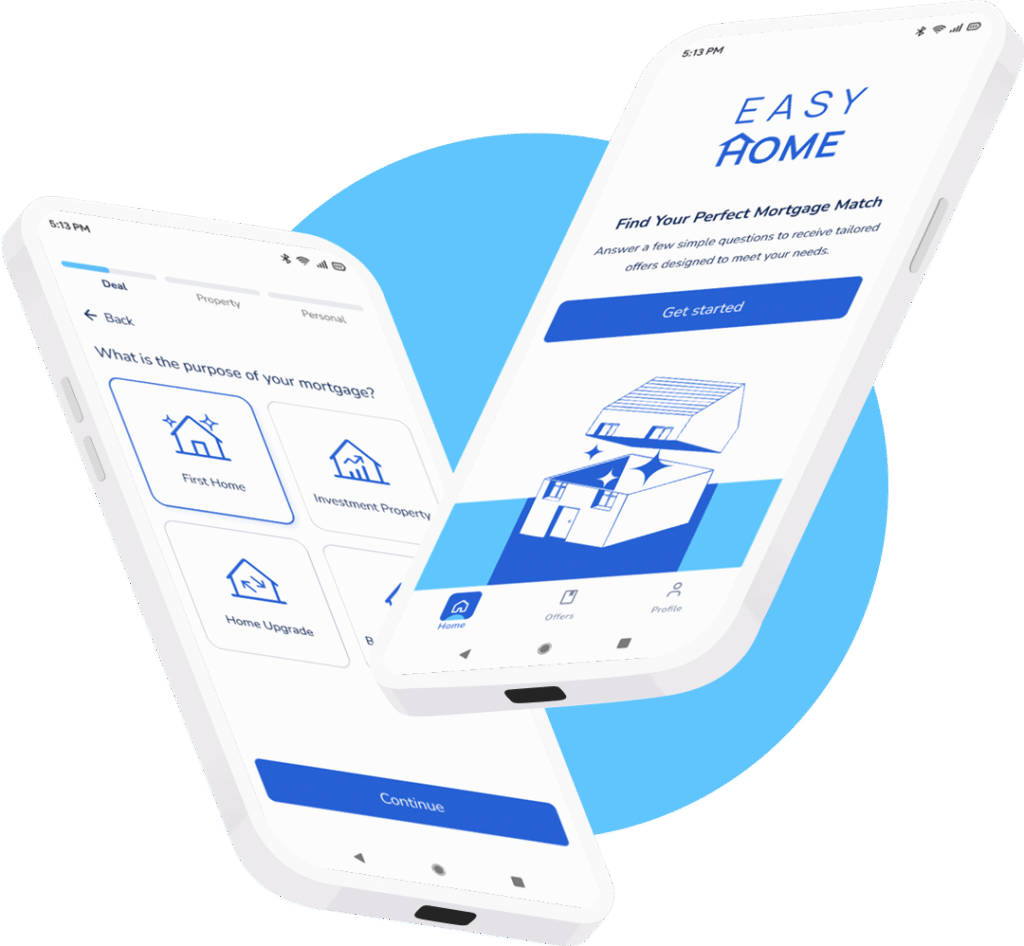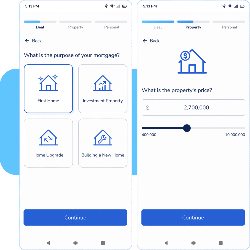 This step-by-step mortgage wizard collects key financial and personal information from users in three short sections: Deal, Property, and Personal. The questions are simple, visual, and designed to help users understand their financial profile and how much they can afford.