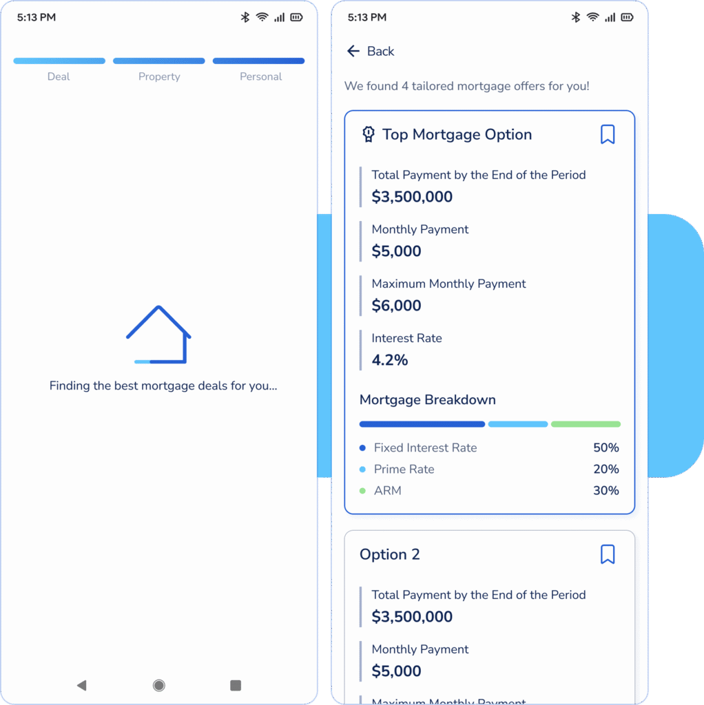 After submitting the questionnaire, users see a short loading screen while the app calculates their best options. The results page presents personalized mortgage offers, starting with the most suitable one. Each card displays essential details like monthly payment, interest rate, and total cost—with an option to save offers for later.
